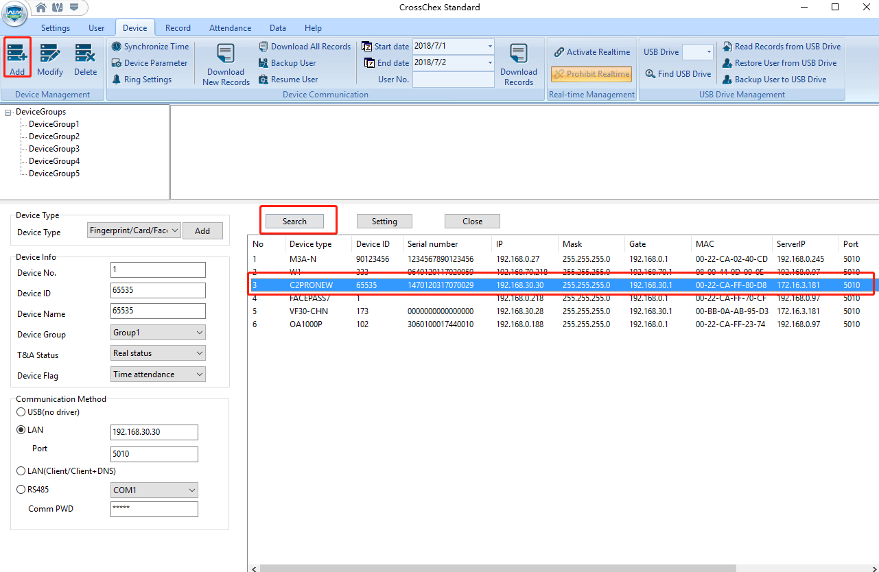 Step 1: Connection via the TCP/IP model. Run the CrossChex, and click the ‘Add’ button, then the ‘Search’ button. All available devices will be listed below. Choose the device that you want to connect to the CrossChex and press the ‘Add’ button.