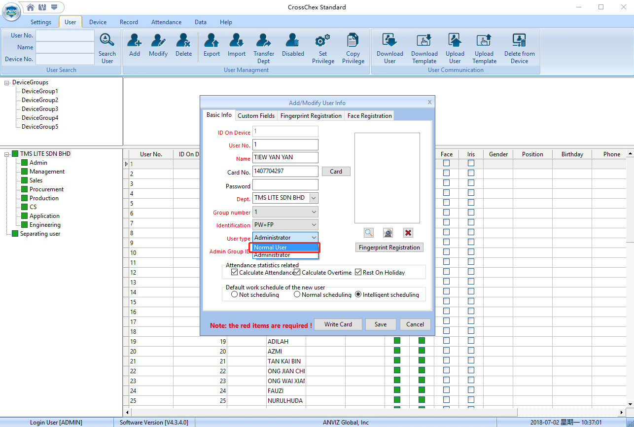 CrossChex -> User -> Select one user -> change Administrator -> Normal user