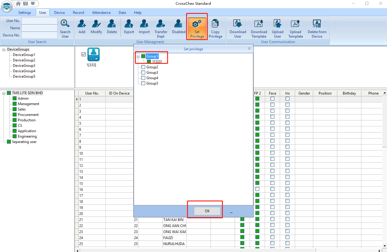 Click ‘Set Privilege’, and choose the group, then click the ‘OK’ button.