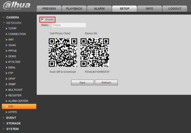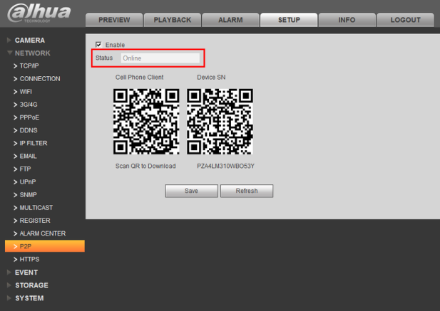1. Check that, “P2P is enabled under, Main Menu->Setup->Network->P2P