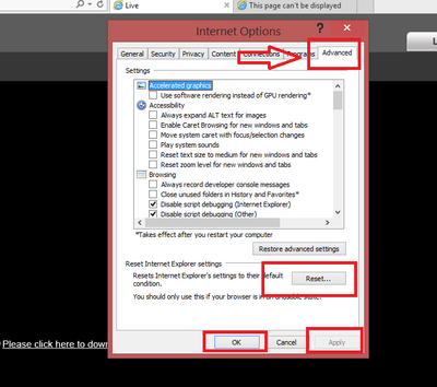 • Click on the Advanced tab ➞ Click Reset ➞ Click Apply ➞ Click OK. You will have to reboot your PC for the changes made.