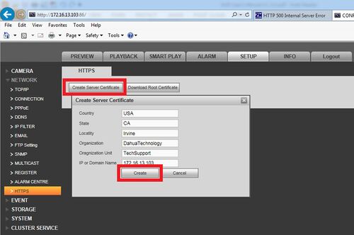 4. Select HTTPS on the left hand column under Network. Then select “Create Server Certificate”, and populate your server Certificate with your country code, state, location (city), the name of your organization or business, the name of the department, and the IP or domain name you wish to operate under. The information here will be used to create the SSL certificate to be authorized.