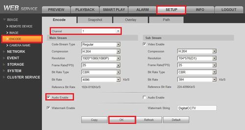 2. After ensuring you are receiving an audio feed, log onto your NVR and make sure your encoding setup is correct (Setup>Image>Encode>) and make sure your are on the right channel where the camera has a working microphone. Now make sure audio is enabled for either or both the Main Stream and Sub Stream (whichever you are recording on)