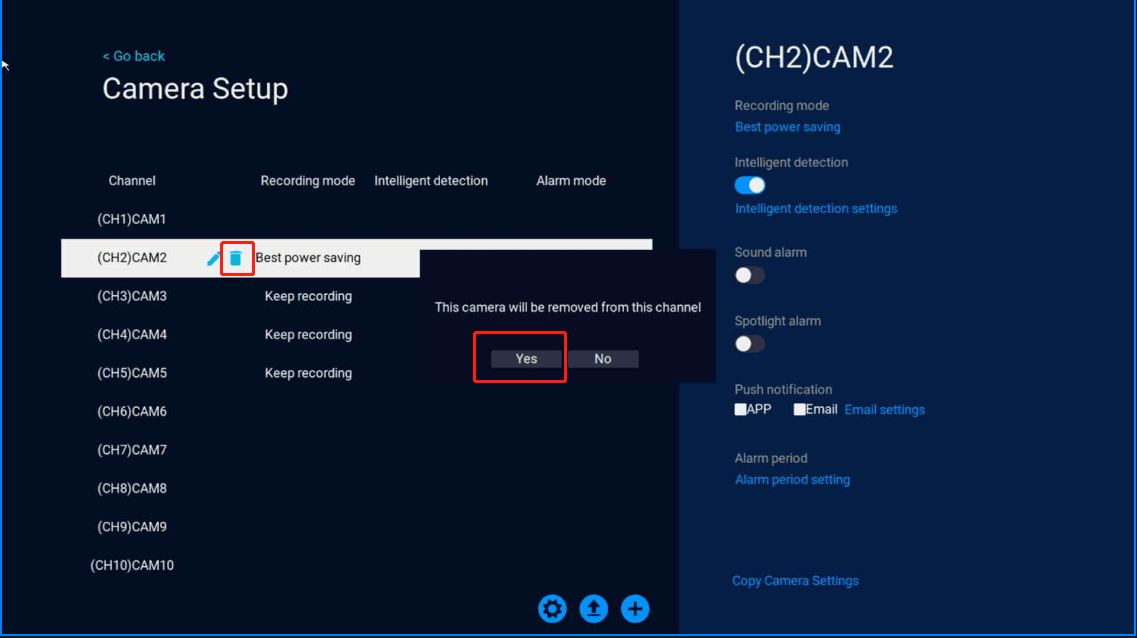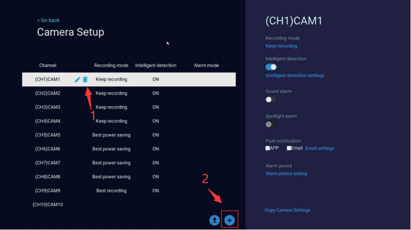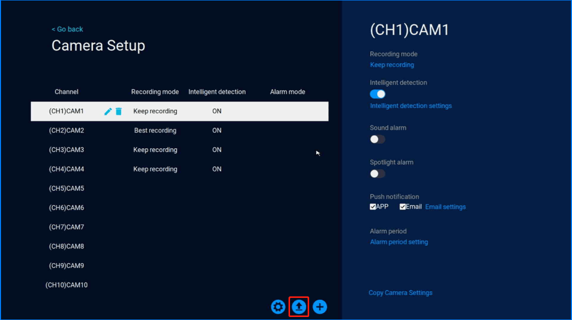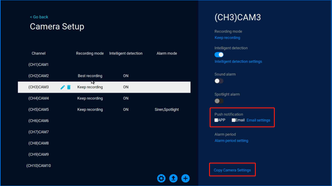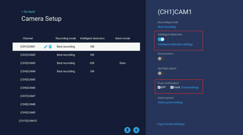 A: 1. Right click the mouse→ Camera→enable Intelligent Detection→Push notification→enable APP, after set it up, click Copy camera settings to set to all channel.