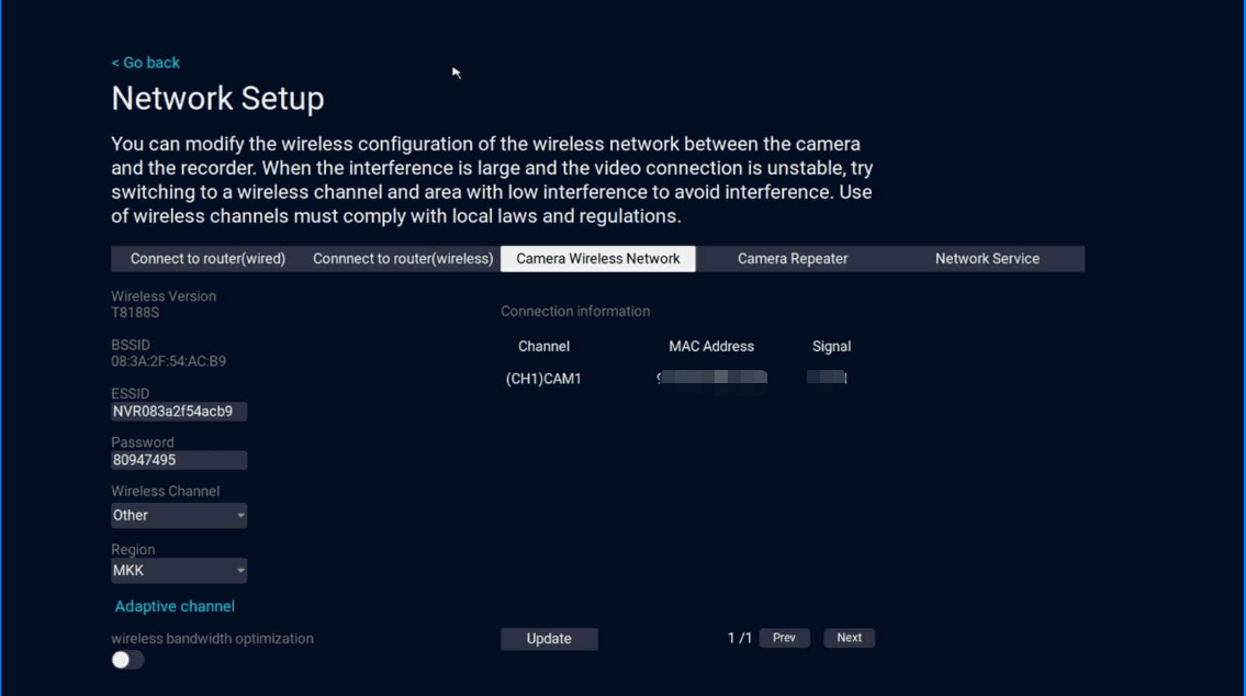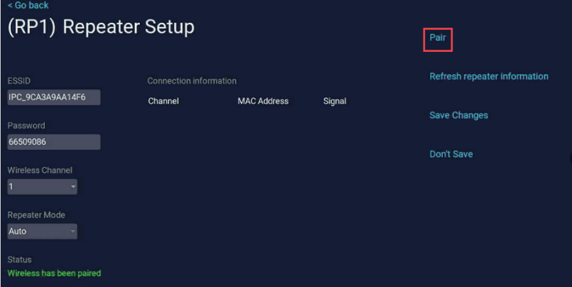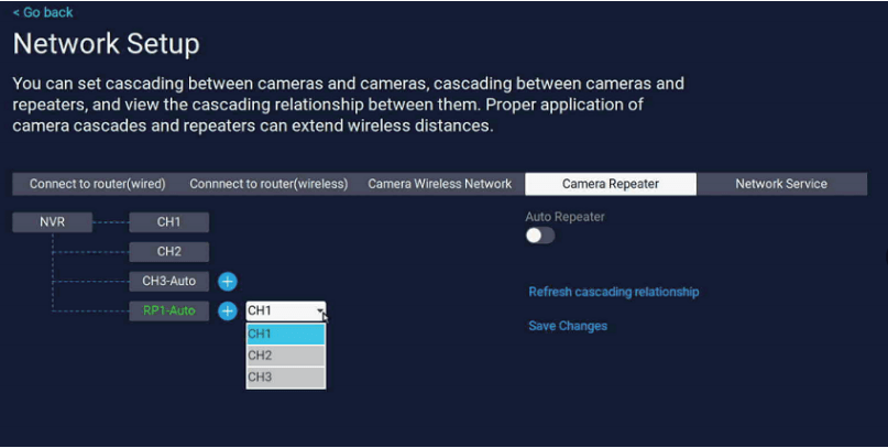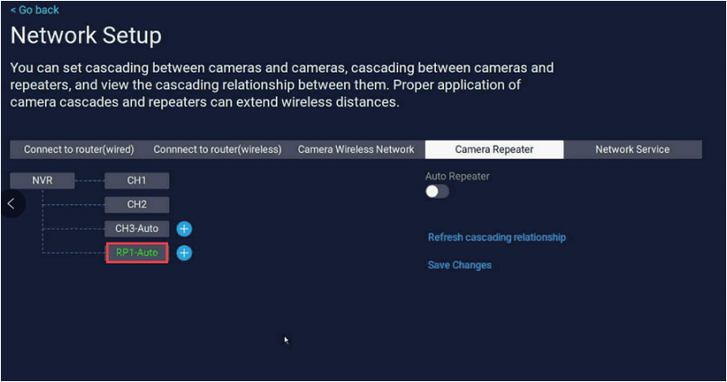 4.When it find repeater, click go back-> go to Network-> Camera Repeater-> click “PR1-Auto” button to pair the repeater. Then unplug the network cable.