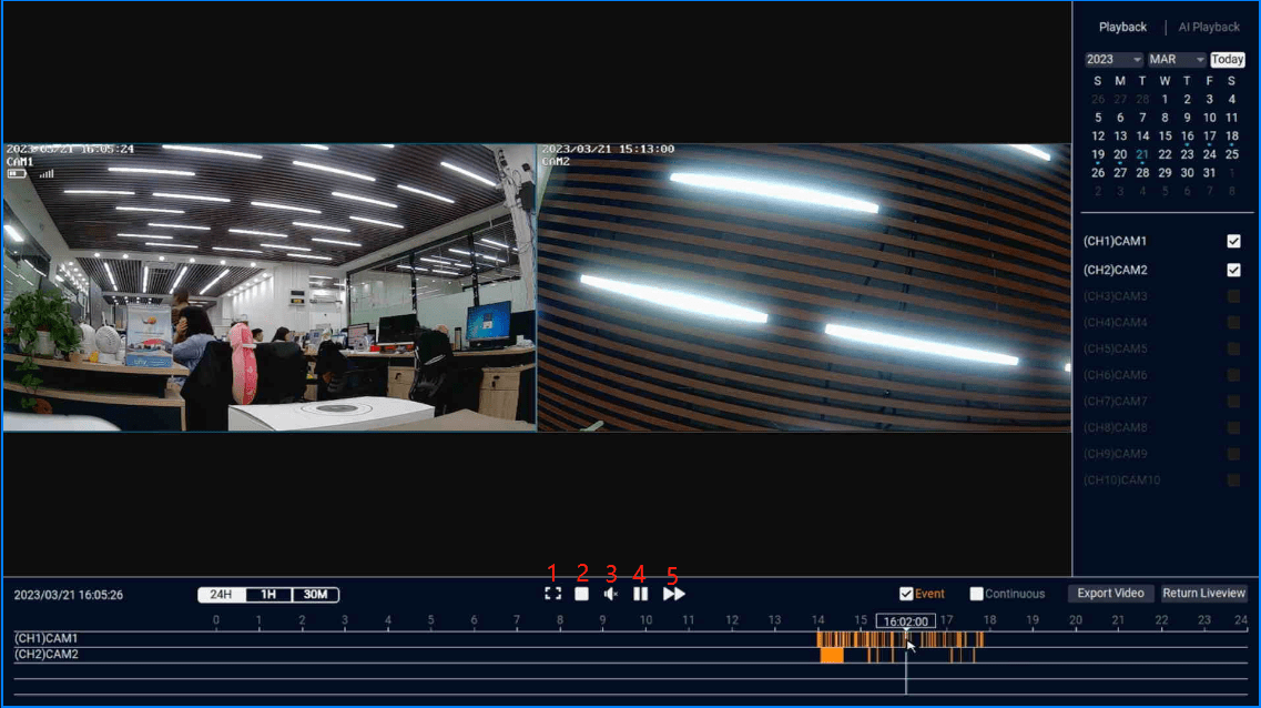 5. Fast forward 2 times, 4 times, 8 times;Timeline: You can click 24H, 1H, 30M in the lower left corner to switch the unit of the time axis. n the area with the video time axis click the left mouse button to start playback from the time the mouse click.Al playback: Click “Al Playback” option on right upper corner and select the options of human shape, and mobile recording to View only the corresponding type of video clips Note: SD card video recording does not support intelligent playback.