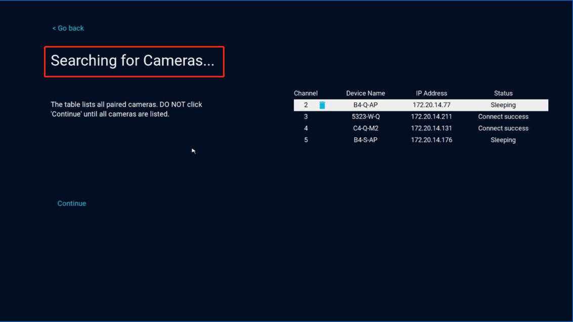5. New camera ip address 172.20.14.** show up, click Continue to complete connection.
