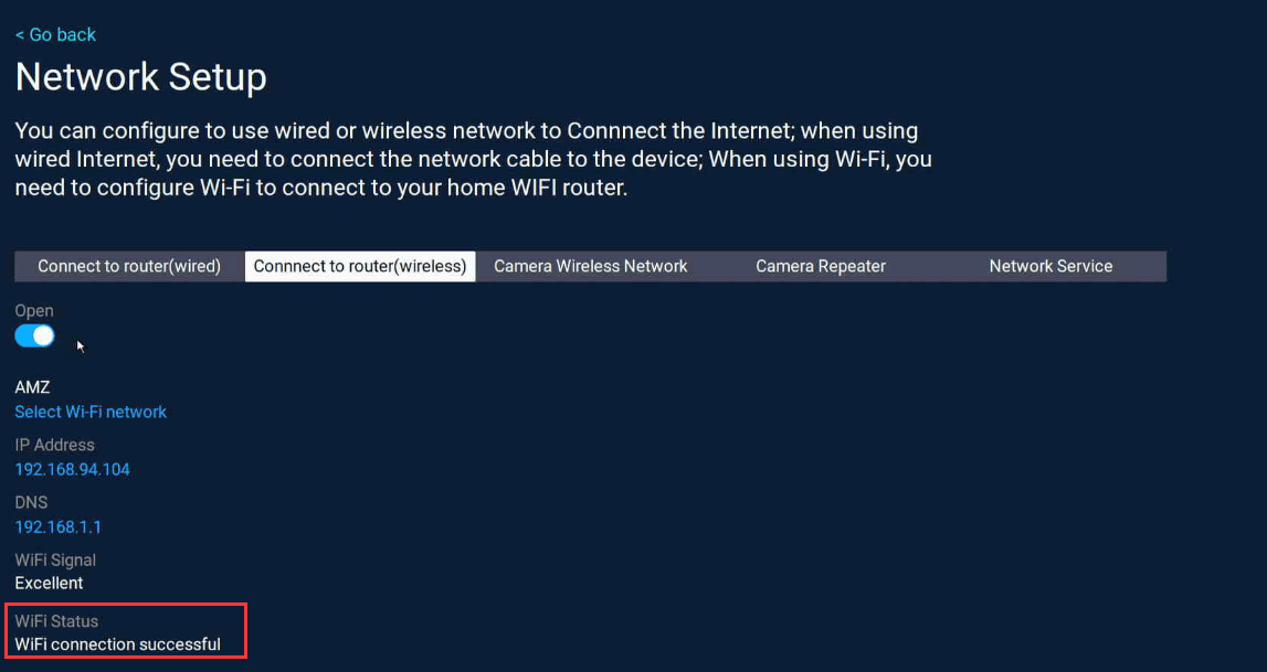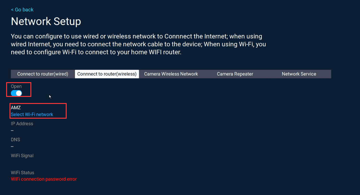 2. Connect to router (Wireless): Connect to your home wifi network, only support 2.4Ghz wifi network, if your home wifi is 5Ghz, it is dual brand wifi, you can set wifi name and password for your 2.4Ghz wifi