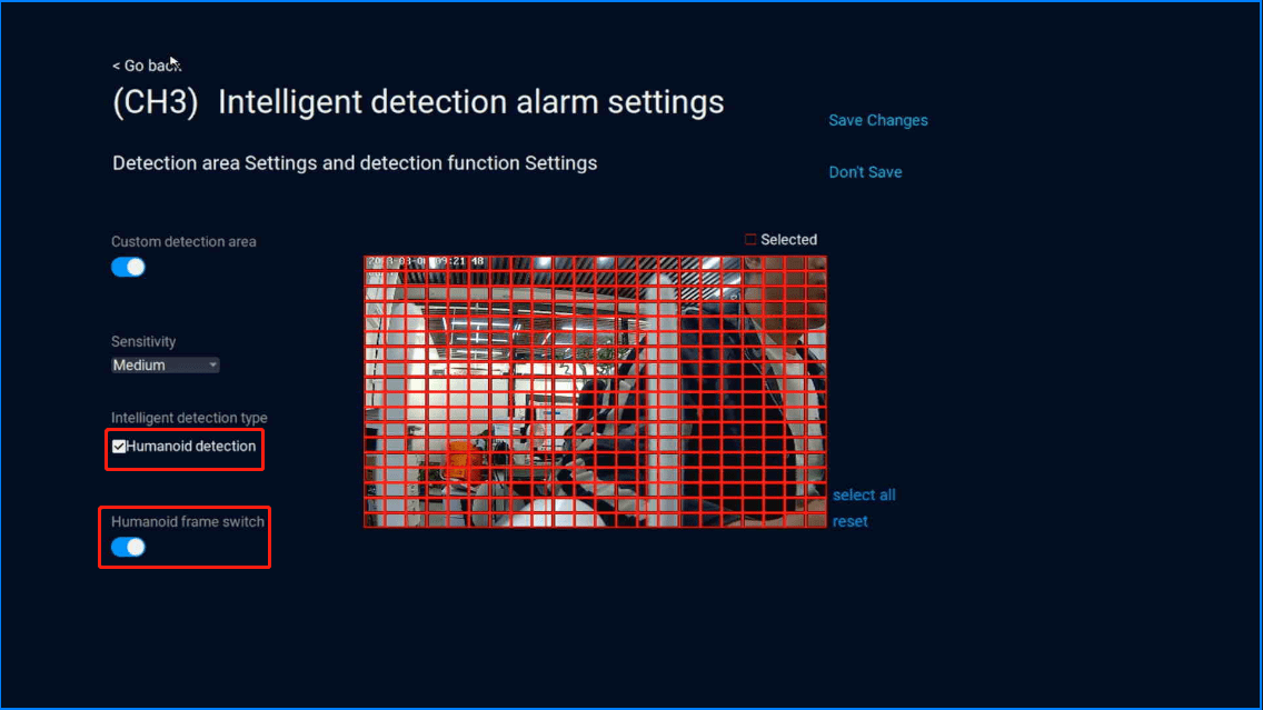 2.Click “Intelligent detection settings”, you can setup motion detection.