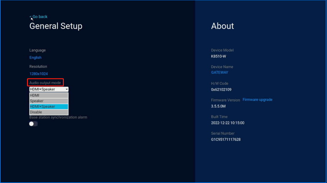 3.If it’s already open, but still can not hear sound, please right click your mouse→ System setup→ General setup→ Audio output mode, select HDMI+Speaker.