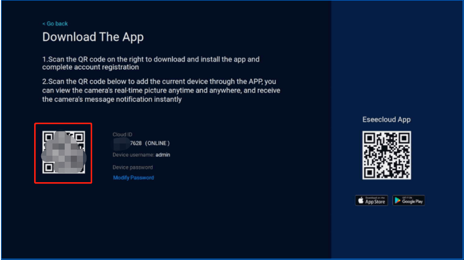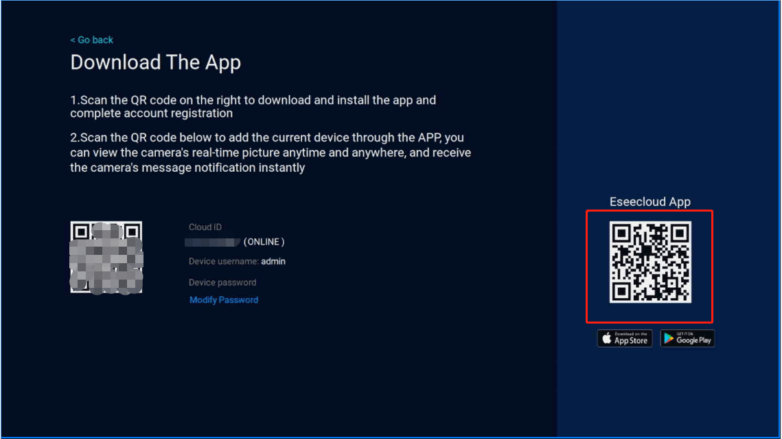 2.Scan below QR code on NVR ”Account/App” download APP or search “Eseecloud” on APP store or Google play.