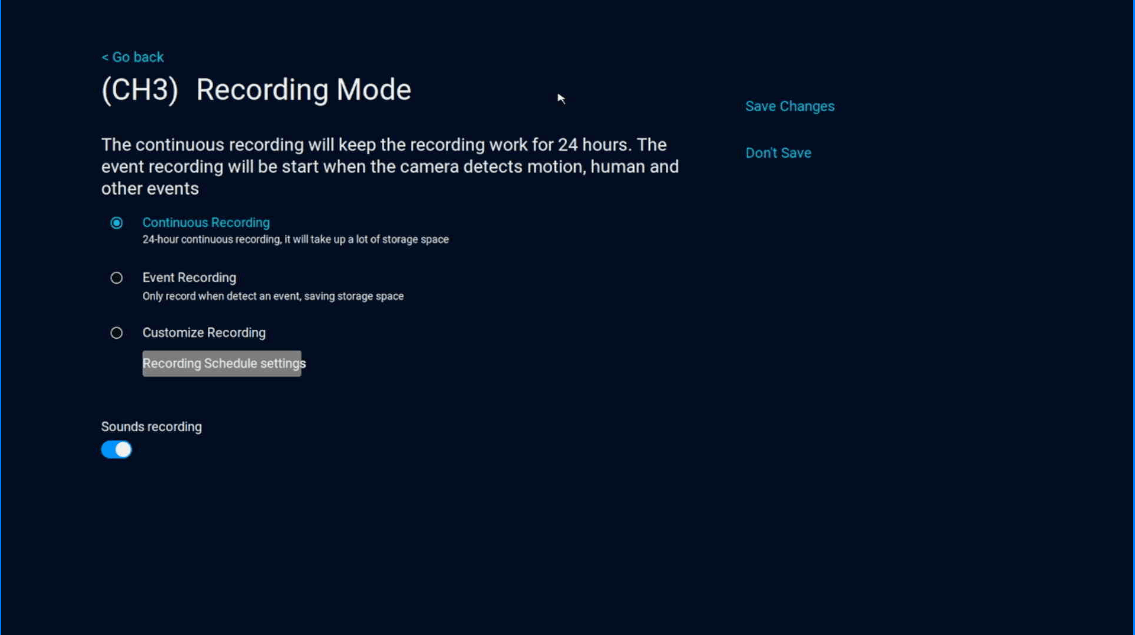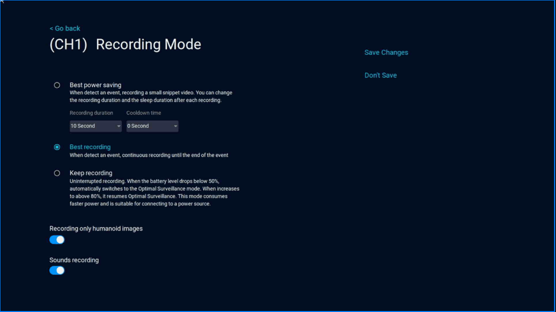 Best power saving: When detect an event, recording a small snippet video. Allow to change the recording duration and the sleep duration after each recording. Recording duration: allow select 5s,10s,20s and 30s.