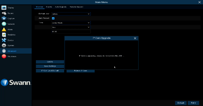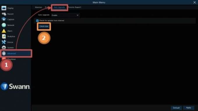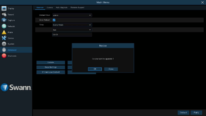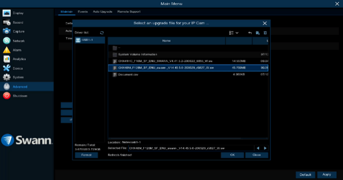 TIP: If updating the firmware via Menu fails, use Swann Security VMS on a Windows computer. Follow Firmware update for OS 5 recorders via Swann Security VMS (Windows)