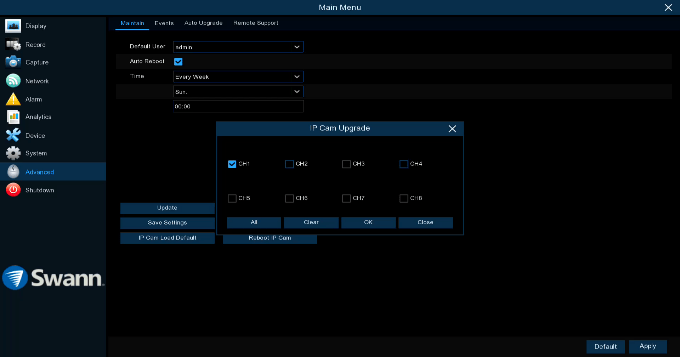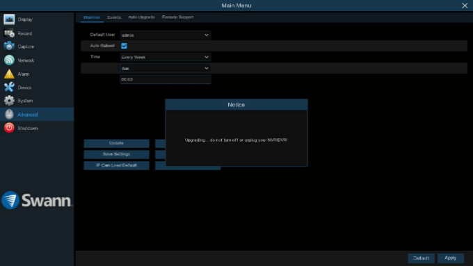 NOTE2: If updating the firmware via Menu fails, use Swann Security VMS on a Windows computer. Follow Firmware update for OS 5 recorders via Swann Security VMS (Windows)