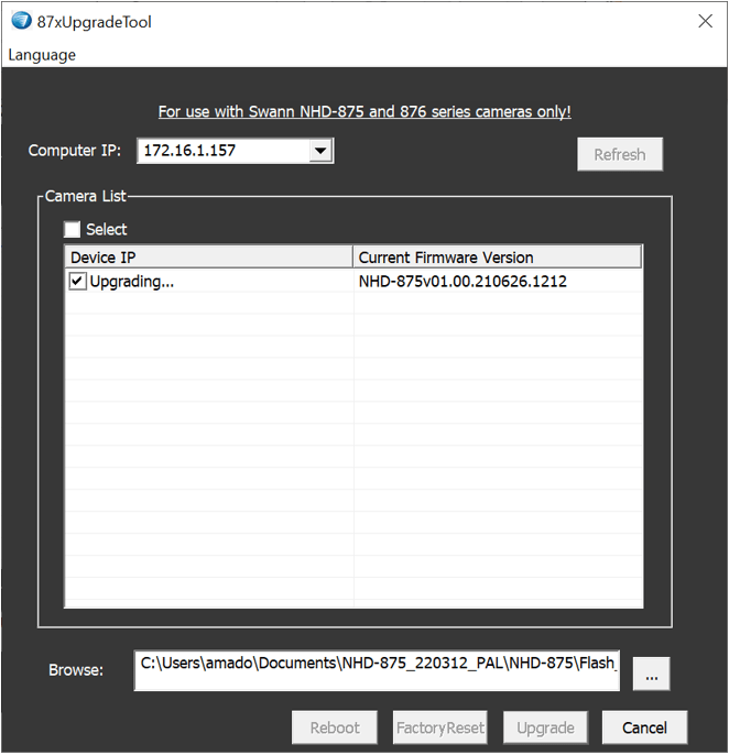 This article will guide you on how to install the latest firmware using the 87x Upgrade tool for the following Swann NHD IP cameras: