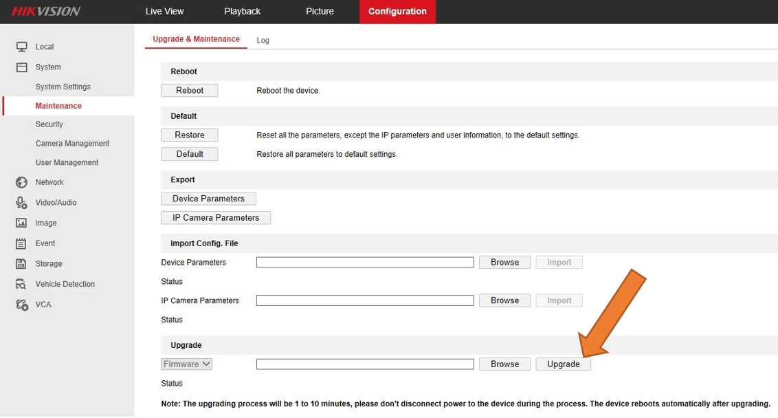 To upgrade the firmware of a Hikvision IP camera, please follow the steps below: