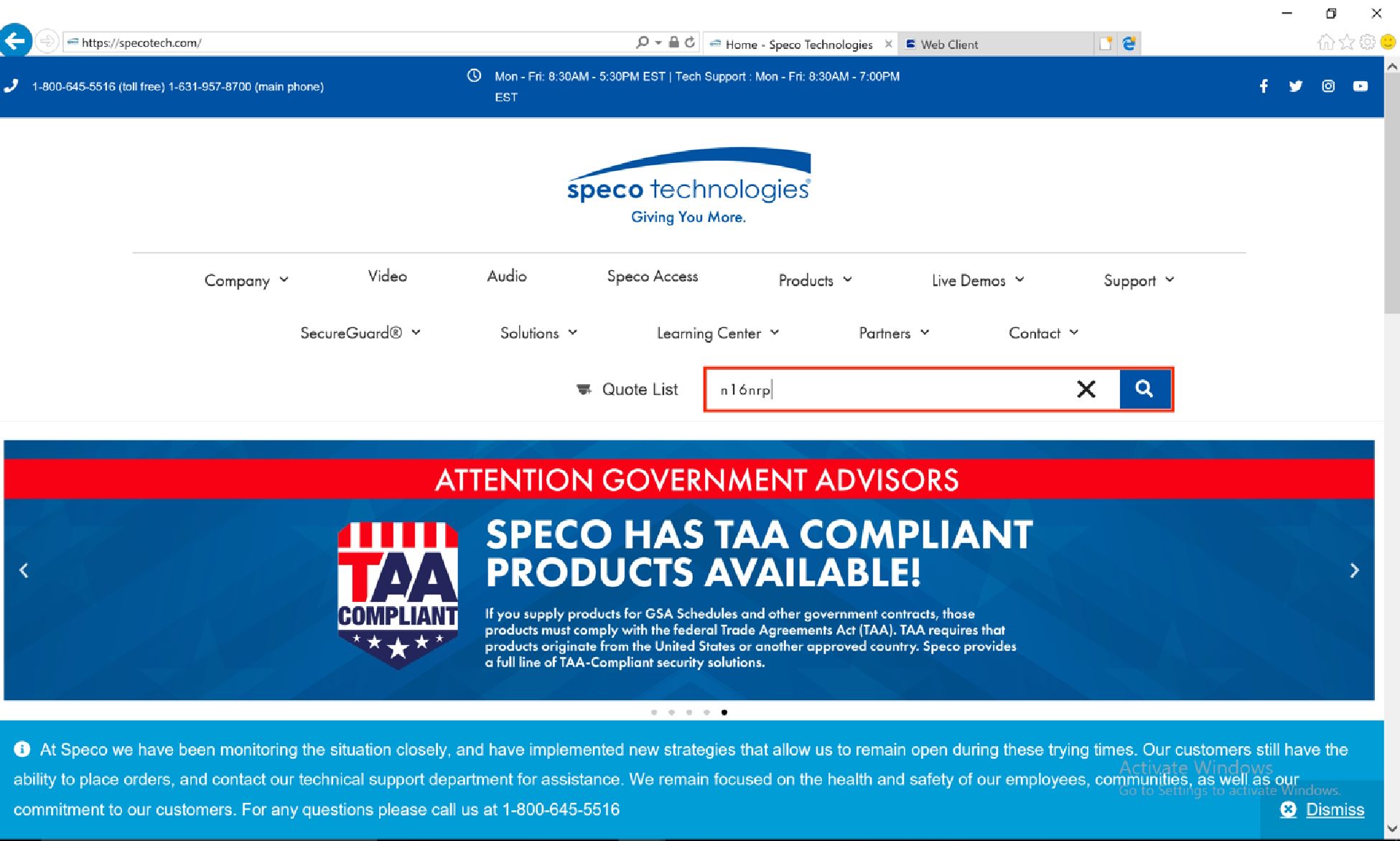 o At Speco we have been monitoring the situation closely, and have implemented new strategies that allow us to remain open during these trying times. Our customers still have the ability to place orders, and contact our technical support department for assistance. We remain focused on the health and safety of our employees, communities, as well as our commitment to our customers. For any questions please call us at 1-800-645-5516 Q Dismiss