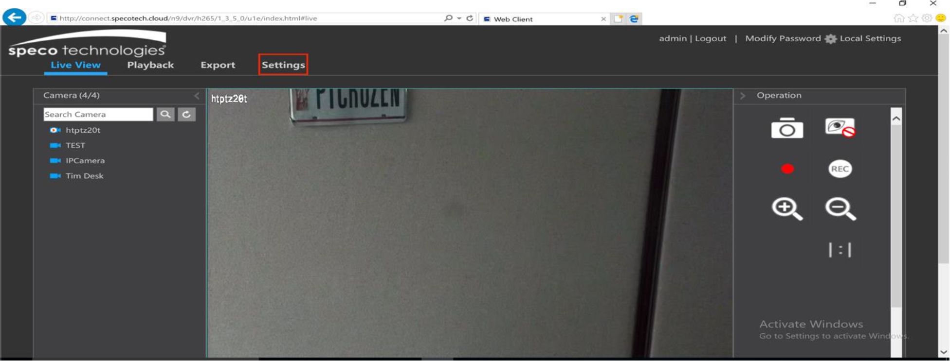 - After you log into the recorder you will see the following screen. click on “settings” to get into the menu.