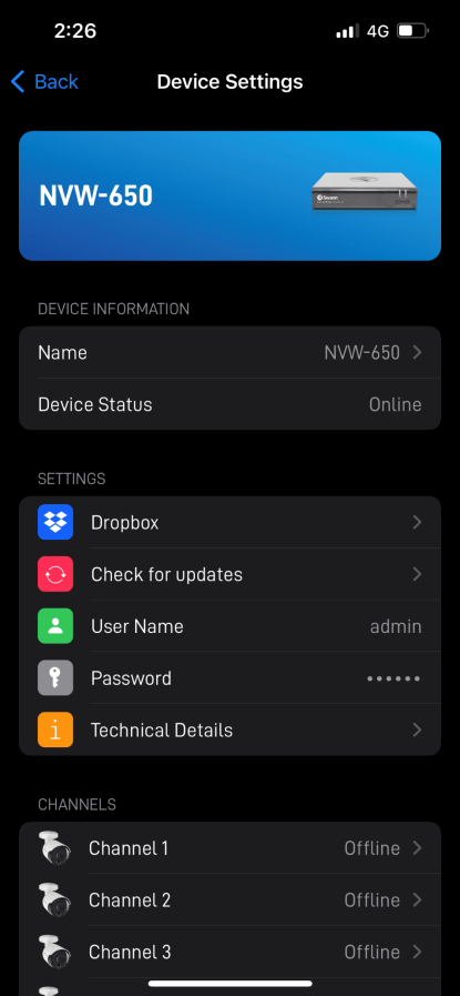 Simply go to Device Settings > choose your recorder. From here, you will then see the User name and Password. Tap the password to unhide it.