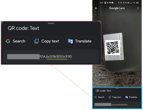 The simplest way is to scan the QR code on top and get the MAC address starting with BC51FE. Some phones have a built-in QR code scanner in their camera app but if none, you may need to download a 3rd party app like Google Lens in this example.