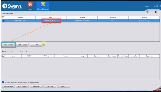 Hit the Search button on the top left side and the tool will search your Swann system over the local network. Once found, note down the MAC address of the system. In this example, the MAC address of this system is BC-51-FE-AA-4C-24.