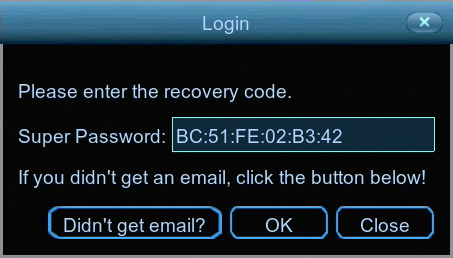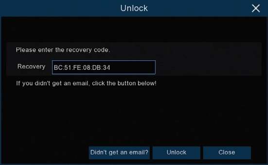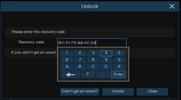 Type the MAC address of your Swann system in the Recovery code field. In this example, type BC:51:FE:AA:4C:24 with the colon symbol. Hit the Enter button, then the Unlock button.