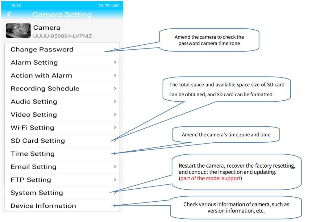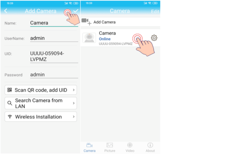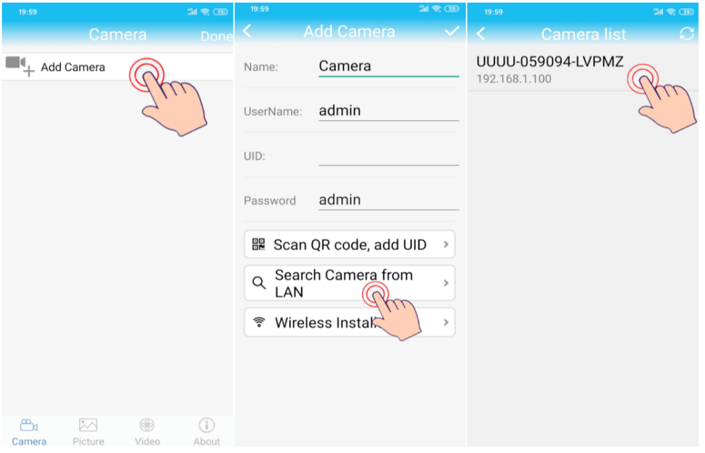 (2)Click “add camera” on APP’s main interface to select “add UID by scanning QR code” (QR code above XXXX-XXXXXX-XXXXXX out of the machine body) or “LAN search UID” after the mobile phone connects the WIFI.
