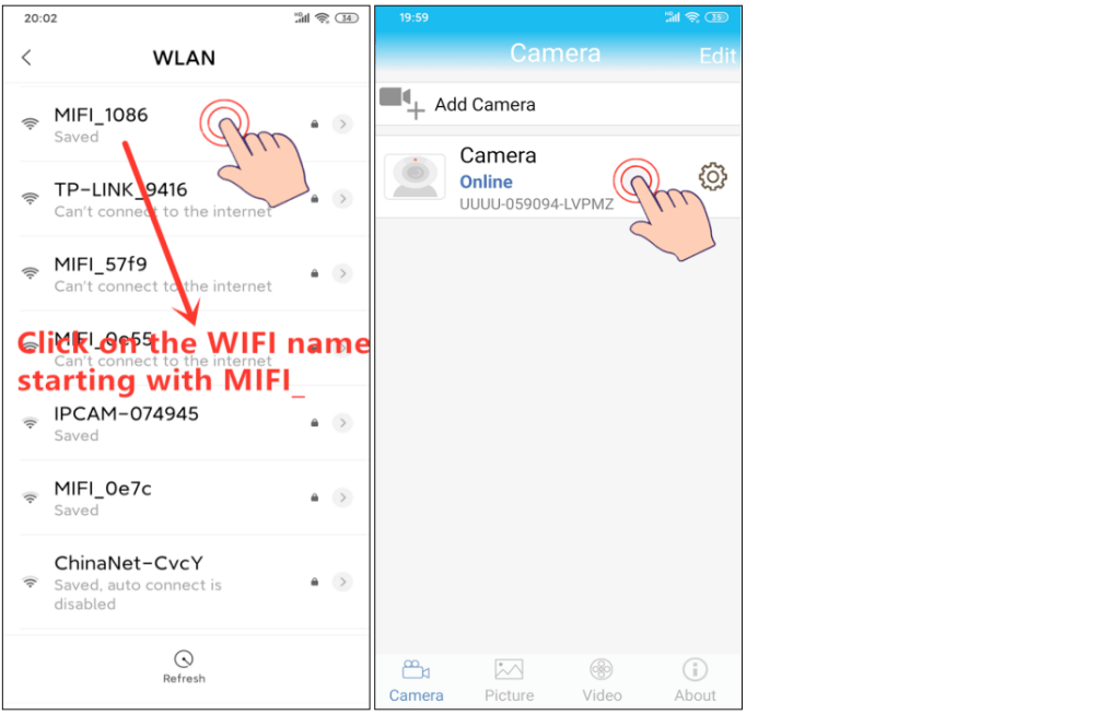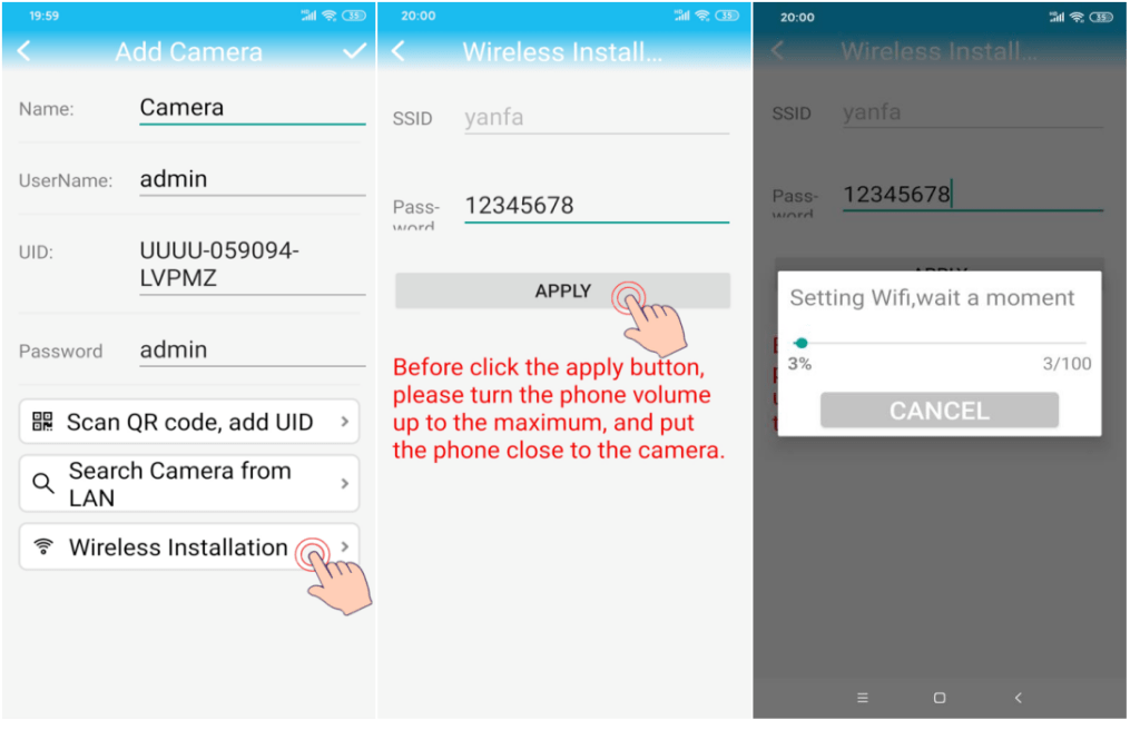 After installing the mobile phone software, the mobile phone connects to WIFI, clicks Add Camera >Wireless Installation> Enter WIFI Password >Do you hear the sound? The system will be equipped with WIFI if it has been selected properly. When the WIFI configuration is successful, there will be voice prompt. (If you don’t have audio equipment, please see the picture prompt)