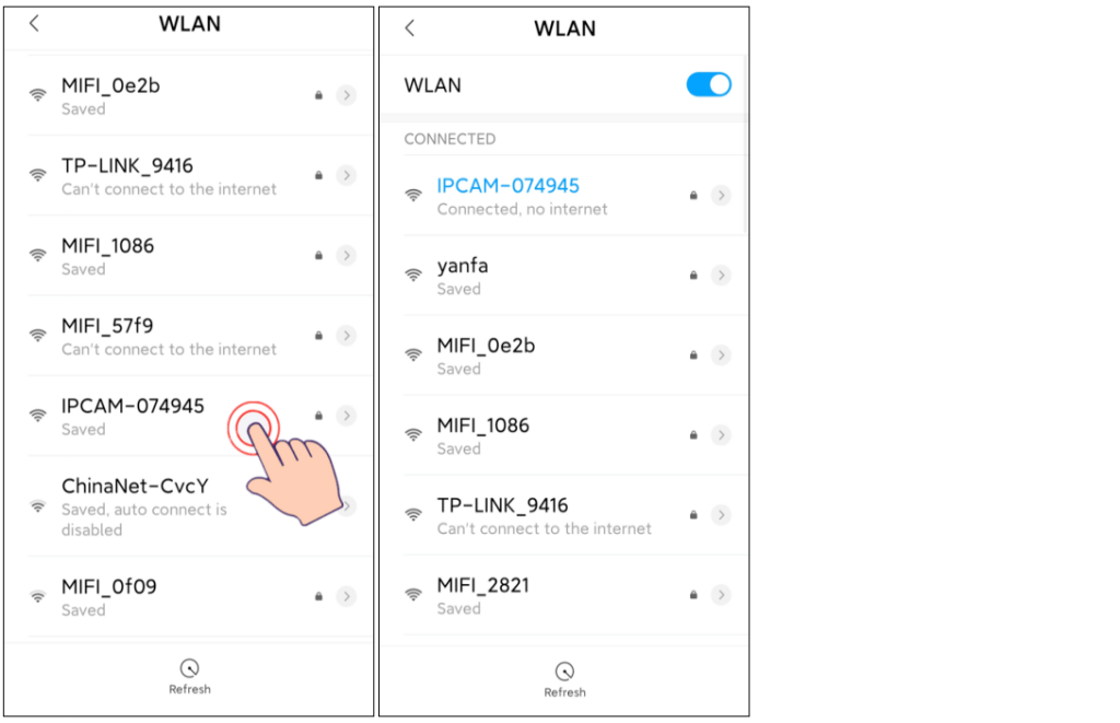 (2) Open the WIFI search, choose the name of WiFi beginning with IPCAM-xxxxx, and enter the original password 01234567 (if you change your password, enter your modified password) as follows: