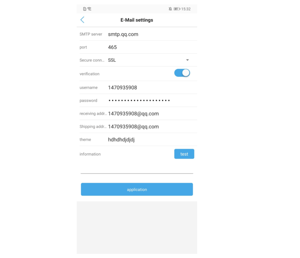 Sender address: sender email address, here is the QQ mailbox as an example, you need to fill in the QQ email address (consistent with the user name). Subjects and content can be filled in casually. After filling out, click the Apply button, then click the Test button to check if you can send an alarm email.