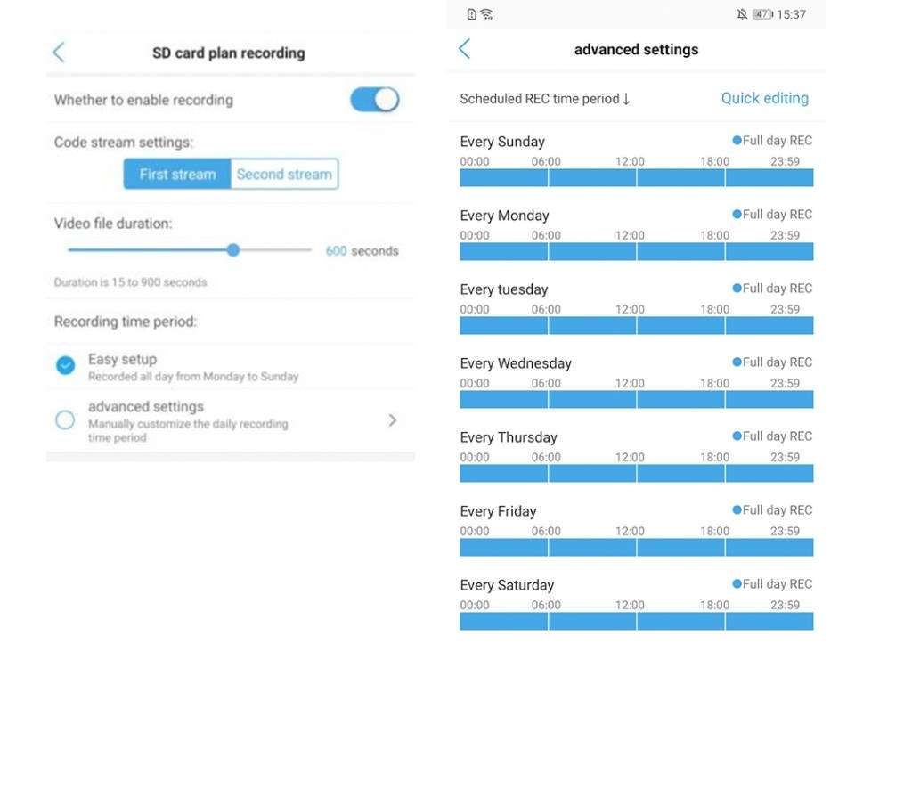 Select Simple settings, the recording time period defaults to Monday-Sunday full-day recording.