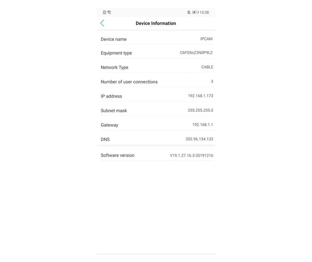 Can get the device information of the camera: including device name, device type, Network type, number of user connections, software version, IP address, Subnet mask, gateway, DNS, etc.