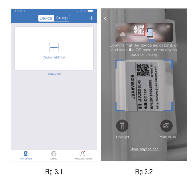(1). After logging in, jump to the device list and click the “+” add button on the interface (Figure 3.1) to jump to the QR code scanning interface (Figure 3.2).