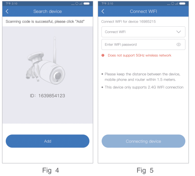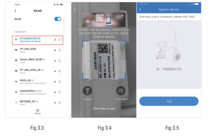 (1). Open the EseeCloud APP, enter the QR code scanning interface to scan the QR code on the device or the monitor (Figure 3.4), and in the search device interface (Figure 3.5), click “Add”;