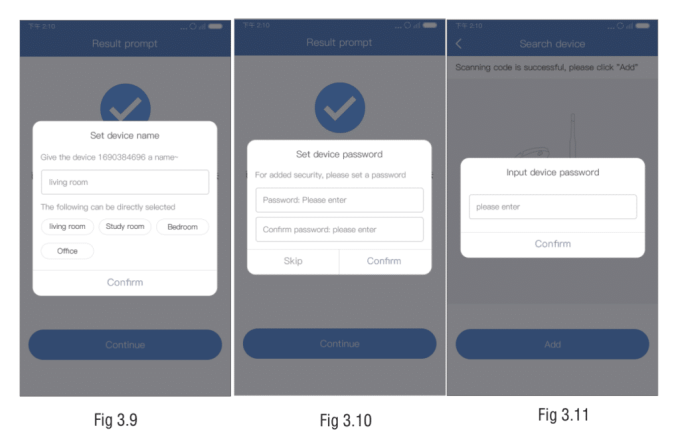 Direct connection: Click the “Direct connection” button (Figure 3.6) and pop-up box for setting the device name, and follow the interface steps to complete the device name and password settings (Figure 3.9, 3.10); after adding successfully, return to the device list to display the added device.