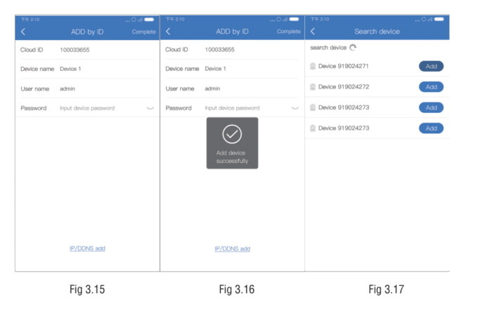 Click the “+” add button on the device list to jump to the scan code scanning interface, scan the shared device QR code, enter the search device interface, confirm the addition, and return to the device list interface to prompt the addition result. (Figure 3.18-3.20).