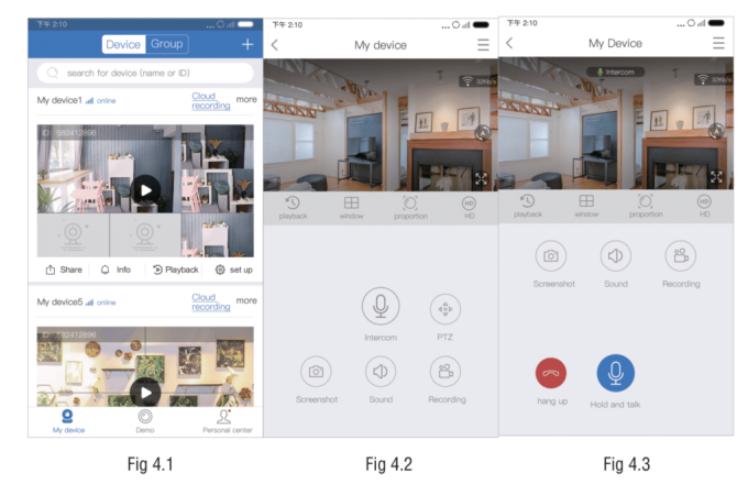 Intercom function: Click the intercom button (Figure 4.2), and the APP initiates an intercom to the device. After the launch is successful, it prompts that the intercom is successful. The interface displays the intercom and hang-up buttons (Figure 4.3). Click the hang-up button to end the intercom (when the device is in the intercom state, other users cannot initiate an intercom to the device).