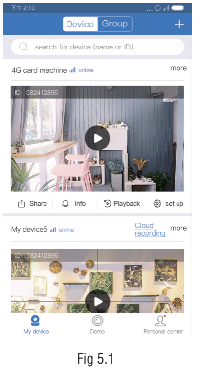 Device list: After adding the device successfully, the device list will display the device card, showing the device name, online and offline status, sharing, playback, alarm messages, settings, and more function buttons; click the thumbnail to enter the preview interface. (figure 4.1).