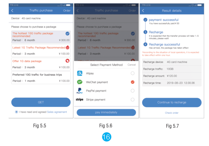 (1) On the 4G card management interface, click the “Recharge Data” button(Figure 5.4) to enter the data purchase interface (Figure 5.5). After selecting the package and payment method, click Pay Now (Figure 5.6);(2) After completing the payment, return to the APP and display the details of the result. After the recharge is successful, the recharge device, traffic, and other information will be displayed (Figure 5.7).