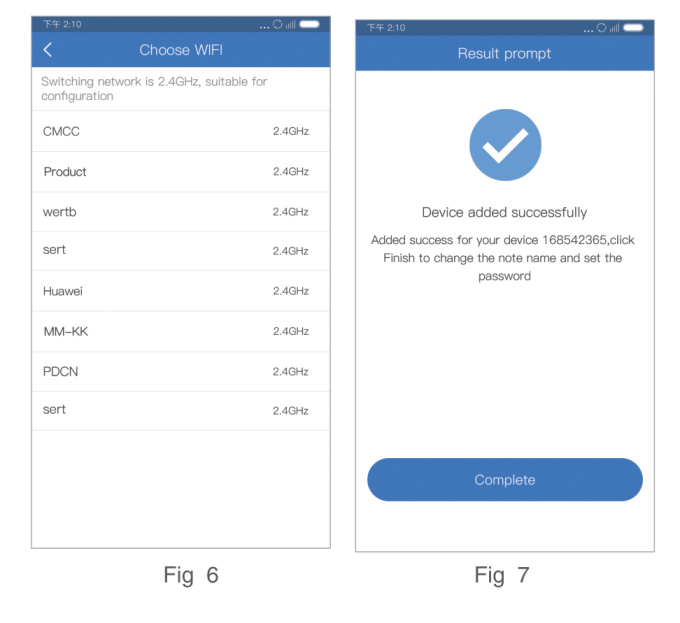 Scan the QR code on the device, and it will jump to the search device interface, then it will display the ID of the current device (Figure 4), click the” Add button” below, make it connect to the WIFI (Figure 5), user can click ” select WIFI” to select the WIFIwhich near the device (Figure 6), then enter the WIFI password, click on the” connected device “to enter the device distribution network interface (Figure 7). Finally, the device distribution network will be successful.