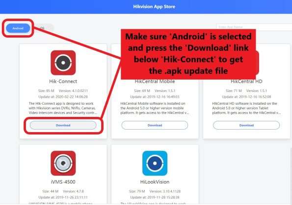 Open Hik-Connect if you have it already installed, and press the Upgrade Now button in the popup. If you don’t have the app installed or do not get this popup upon opening the act, this link to the Hikvision App Store will take you to the update file. You need to make sure you open this page on the Android device that you wish to install the updated software on, as this will be the device that the update file is saved to! In the App store, make sure Android is selected in the top-left hand corner and then select Download beneath Hik-Connect to get the .apk update file.