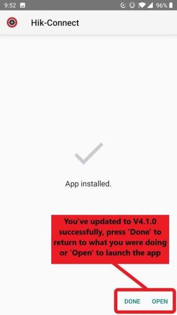 If you get the same screen as the one below, then you’re all done. You should now have the latest version (V4) of Hik-Connect installed on your device. You can either press Open to launch the app, or Done to return back to whatever you were previously doing. If your screen doesn’t say App installed with a tick above, then you’ll need to repeat steps 1-4 again!