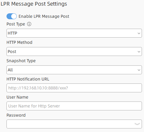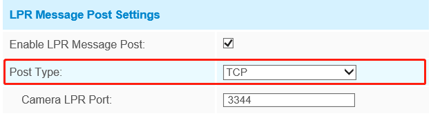 [LPR Message Post Settings]: Check the checkbox to enable LPR Message Post. It will push information to some third-party devices or software that are compatible with ours. Information can be pushed by RTSP, TCP or HTTP.
