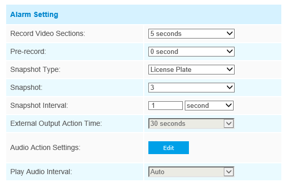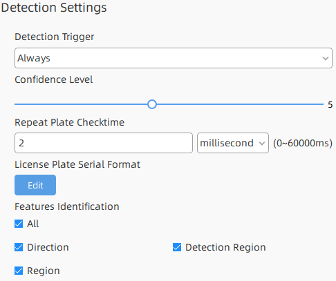 [Detection Trigger]: If you choose “Always”, camera will always detect the license plate. If you choose “Alarm input”, camera will only detect the license plate when Alarm Input is being triggered.