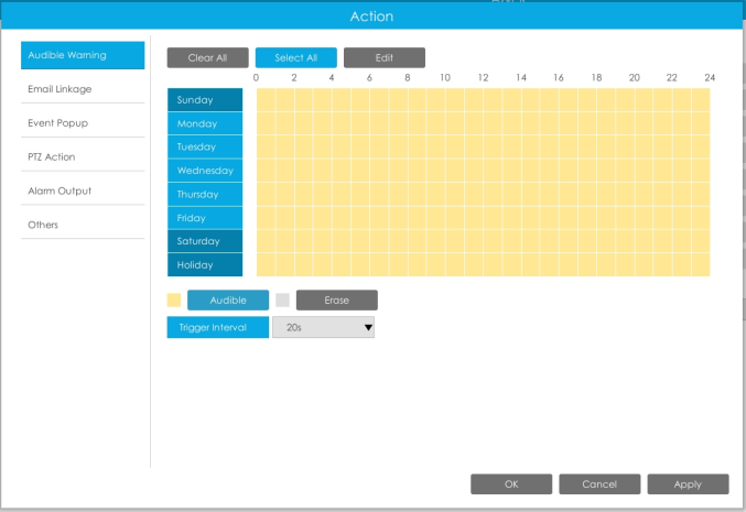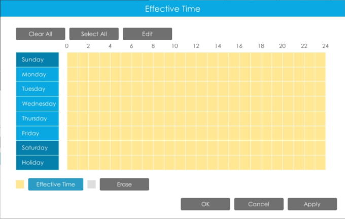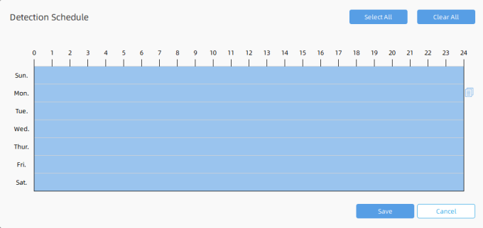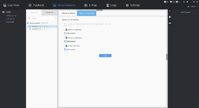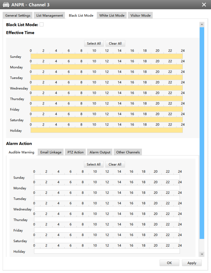 Here you can set effective detection schedules for different detection modes, including Black List Detection, White List Detection and Visitor Detection. Only when the detection is enabled and the corresponding schedule is set, the corresponding detection results will be saved and can be viewed in the ANPR Search interface.