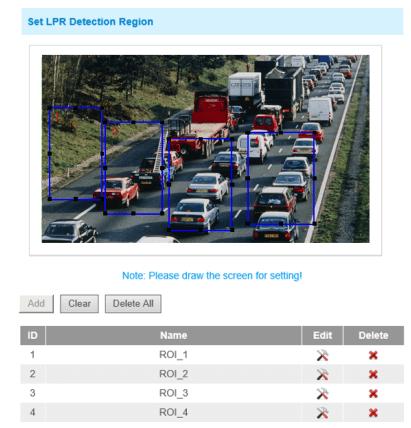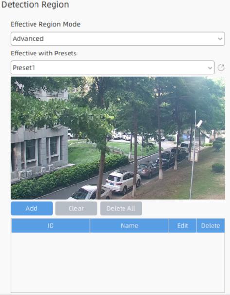 [Set LPR Detection Region]: You can set up to 4 ROI areas by drawing the screen. If you choose Normal Mode, it supports configuring the LPR detection regions for the current area. If you choose Advanced Mode(Only for PTZ series), it supports configuring different LPR detection regions for different PTZ presets(Only support Preset 1~4 so far).