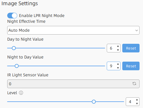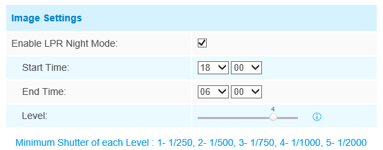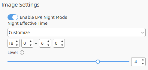 [LPR Night Mode]: Achieve the best effect of LPR night recognition by adjusting different parameter levels. You can also schedule the Start Time and End Time, and adjusting the level according to the environment.