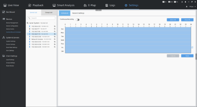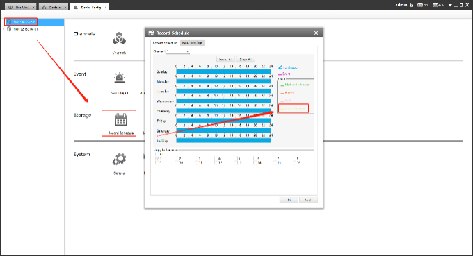 Step1: Select a camera in the devices list tree in the Settings -> Devices -> Camera Record Schedule -> Schedule interface, then click