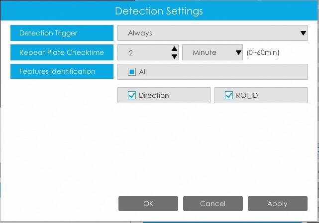 [Detection Trigger]: If you choose “Always”, camera will always detect the license plates. If you choose “Alarm Input”, camera will only detect the license plates during Alarm Input is being triggered.