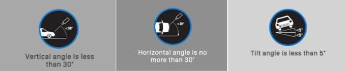 To avoid capturing unnecessary contents in the image, the camera should be installed in a higher position(Vertical angle is less than 30°; Horizontal angle is no more than 30°; Tile angle is less than 5°) to capture the front part of the vehicle.